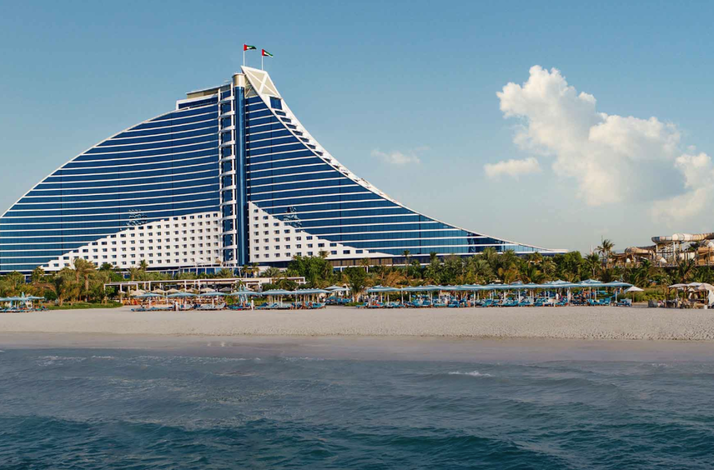 The Jumeirah Beach Hotel, an iconic luxury resort located in Dubai, United Arab Emirates, boasts around 600 rooms and suites. Its architectural design features a striking wave-like shape, providing stunning views of the Arabian Gulf.